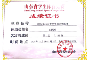 近日,2025年山東省學(xué)生武術(shù)錦標(biāo)賽在魯東大學(xué)圓滿落幕。煙臺四中代表隊(duì)由劉云翔、吳天宇、王躍淵、白昊麟四位同學(xué)組成。賽場上,他們奮勇爭先、英姿颯爽,憑借精湛的武術(shù)技藝和穩(wěn)定的臨場發(fā)揮,一路過關(guān)斬將,斬獲單項(xiàng)4金2銀1銅及1個(gè)第五名的亮眼成績,更以出色的團(tuán)隊(duì)協(xié)作力將團(tuán)體總分第二名收入囊中。?