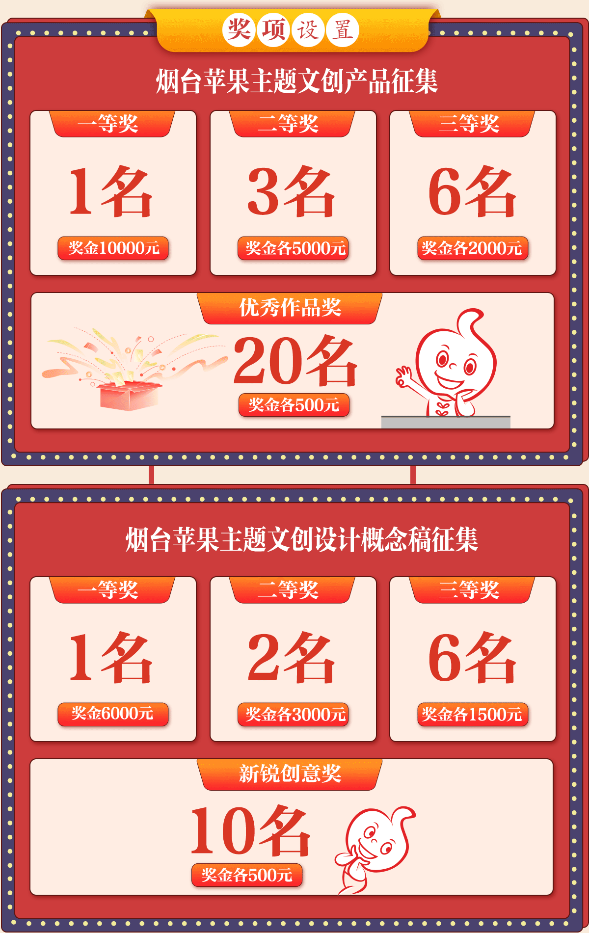 (2)煙臺蘋果主題文創(chuàng)產(chǎn)品征集參賽作品為設(shè)計稿+打樣實物。作品征集階段提供設(shè)計稿,凡通過初審入圍的參賽單位,組委會將通知作者,進行樣品郵寄。(組委會承擔(dān)打樣費用,不高于1000元/件)。